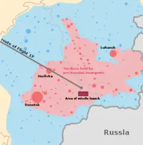 Le trajet du vol MH17 le diffère de ceux empruntés les jours précédents qui visaient à éviter le survol des zones de conflit[18] : l'avion, en empruntant un couloir aérien plus au nord, et ce pour une raison que l'enquête n'a pas encore mise au jour, survole la zone où s'affrontent les combattants de la république populaire de Donetsk (RPD) et l'armée ukrainienne (ZSU).