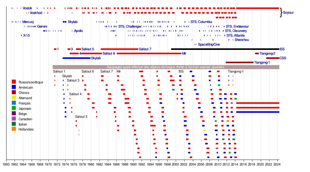 Au début de la nouvelle course à l'espace entre les États-Unis et l'URSS, ce sont les Soviétiques qui prirent de l'avance : ils mirent en orbite le premier satellite artificiel, Spoutnik 1, le [C 2], puis envoyèrent le premier homme dans l'espace, Youri Gagarine, le . Les programmes spatiaux changèrent pour tenter de mieux comprendre l'influence de l'homme dans l'espace : au cours des vols, les astronautes passèrent de plus en plus de temps en orbite, battant record après record, et réalisèrent même les sorties extra-véhiculaires.