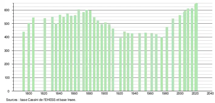 L'évolution du nombre d'habitants est connue à travers les recensements de la population effectués dans la commune depuis 1793. Pour les communes de moins de 10 000 habitants, une enquête de recensement portant sur toute la population est réalisée tous les cinq ans, les populations légales des années intermédiaires étant quant à elles estimées par interpolation ou extrapolation[18]. Pour la commune, le premier recensement exhaustif entrant dans le cadre du nouveau dispositif a été réalisé en 2005[19].