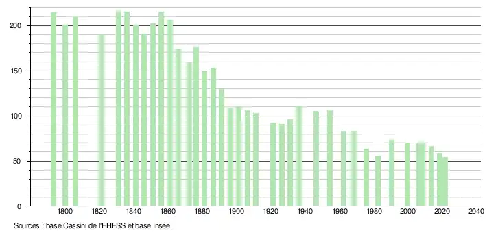 L'évolution du nombre d'habitants est connue à travers les recensements de la population effectués dans la commune depuis 1793. Pour les communes de moins de 10 000 habitants, une enquête de recensement portant sur toute la population est réalisée tous les cinq ans, les populations légales des années intermédiaires étant quant à elles estimées par interpolation ou extrapolation[18]. Pour la commune, le premier recensement exhaustif entrant dans le cadre du nouveau dispositif a été réalisé en 2008[19].