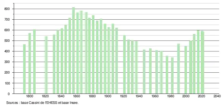 L'évolution du nombre d'habitants est connue à travers les recensements de la population effectués dans la commune depuis 1793. Pour les communes de moins de 10 000 habitants, une enquête de recensement portant sur toute la population est réalisée tous les cinq ans, les populations légales des années intermédiaires étant quant à elles estimées par interpolation ou extrapolation[20]. Pour la commune, le premier recensement exhaustif entrant dans le cadre du nouveau dispositif a été réalisé en 2005[21].