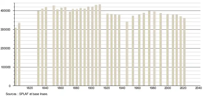 La population du département est restée très longtemps stable. La diminution des activités agricoles étant compensée par l'essor industriel, le département passa de 397 987 habitants en 1831 à 433 914 en 1911, progressant lentement mais assez régulièrement. Tombée à 383 684 habitants en 1921, la population se maintiendra ensuite, culminant à 397 957 en 1975. Depuis cette date, la population du département baisse régulièrement du fait notamment de la désindustrialisation.