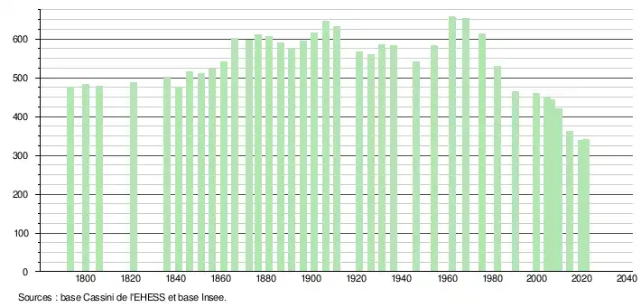 L'évolution du nombre d'habitants est connue à travers les recensements de la population effectués dans la commune depuis 1793. Pour les communes de moins de 10 000 habitants, une enquête de recensement portant sur toute la population est réalisée tous les cinq ans, les populations légales des années intermédiaires étant quant à elles estimées par interpolation ou extrapolation[9]. Pour la commune, le premier recensement exhaustif entrant dans le cadre du nouveau dispositif a été réalisé en 2004[10].