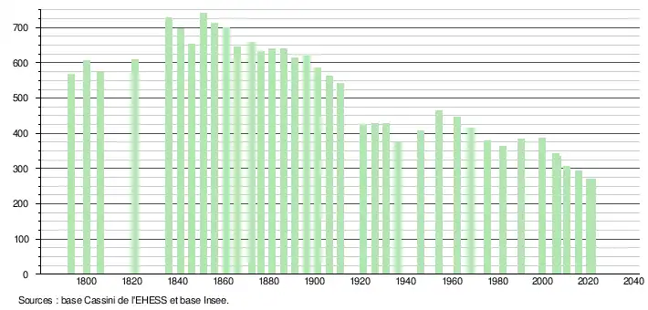 L'évolution du nombre d'habitants est connue à travers les recensements de la population effectués dans la commune depuis 1793. Pour les communes de moins de 10 000 habitants, une enquête de recensement portant sur toute la population est réalisée tous les cinq ans, les populations légales des années intermédiaires étant quant à elles estimées par interpolation ou extrapolation[18]. Pour la commune, le premier recensement exhaustif entrant dans le cadre du nouveau dispositif a été réalisé en 2005[19].