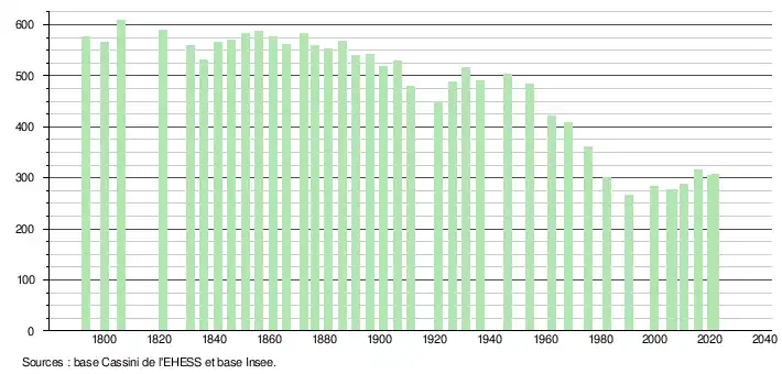 L'évolution du nombre d'habitants est connue à travers les recensements de la population effectués dans la commune depuis 1793. Pour les communes de moins de 10 000 habitants, une enquête de recensement portant sur toute la population est réalisée tous les cinq ans, les populations légales des années intermédiaires étant quant à elles estimées par interpolation ou extrapolation[23]. Pour la commune, le premier recensement exhaustif entrant dans le cadre du nouveau dispositif a été réalisé en 2005[24].