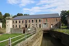 Un moulin à eau, dont les vestiges sont encore présents de nos jours, est symbolisé par une roue dentée sur la rivière.