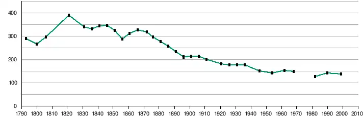 L'évolution du nombre d'habitants est connue à travers les recensements de la population effectués dans la commune depuis 1793. Pour les communes de moins de 10 000 habitants, une enquête de recensement portant sur toute la population est réalisée tous les cinq ans, les populations légales des années intermédiaires étant quant à elles estimées par interpolation ou extrapolation[16]. Pour la commune, le premier recensement exhaustif entrant dans le cadre du nouveau dispositif a été réalisé en 2004[17].