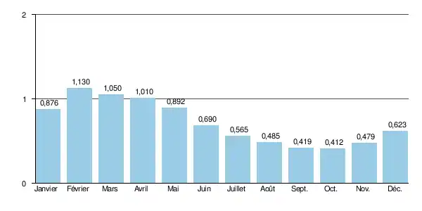 Sur cette période d'observation, le débit journalier maximal a été observé le pour 10,00 m3/s. Le débit instantané maximal a été observé le même [note 3] avec 14,40 m3/s en même temps que la hauteur maximale instantanée de 129 cm soit 1,29 m[2].