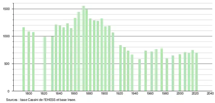 L'évolution du nombre d'habitants est connue à travers les recensements de la population effectués dans la commune depuis 1793. Pour les communes de moins de 10 000 habitants, une enquête de recensement portant sur toute la population est réalisée tous les cinq ans, les populations légales des années intermédiaires étant quant à elles estimées par interpolation ou extrapolation[18]. Pour la commune, le premier recensement exhaustif entrant dans le cadre du nouveau dispositif a été réalisé en 2006[19].