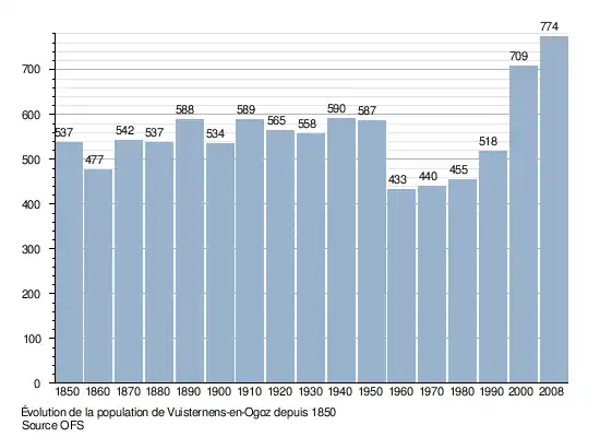 Le graphique suivant résume l'évolution de la population de Vuisternens-en-Ogoz entre 1850 et 2008[4] :