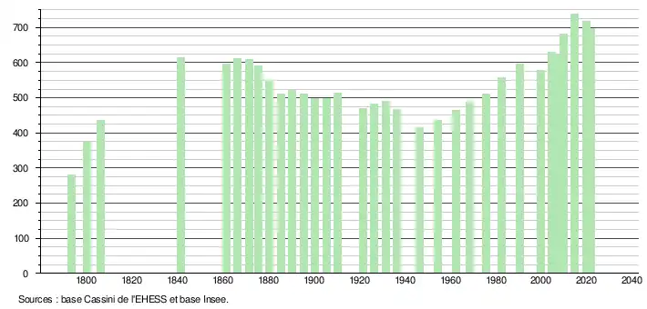 L'évolution du nombre d'habitants est connue à travers les recensements de la population effectués dans la commune depuis 1793. Pour les communes de moins de 10 000 habitants, une enquête de recensement portant sur toute la population est réalisée tous les cinq ans, les populations légales des années intermédiaires étant quant à elles estimées par interpolation ou extrapolation[19]. Pour la commune, le premier recensement exhaustif entrant dans le cadre du nouveau dispositif a été réalisé en 2004[20].