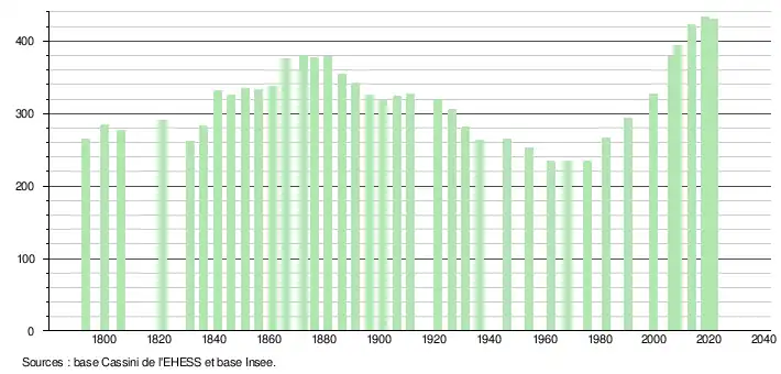 L'évolution du nombre d'habitants est connue à travers les recensements de la population effectués dans la commune depuis 1793. Pour les communes de moins de 10 000 habitants, une enquête de recensement portant sur toute la population est réalisée tous les cinq ans, les populations légales des années intermédiaires étant quant à elles estimées par interpolation ou extrapolation[39]. Pour la commune, le premier recensement exhaustif entrant dans le cadre du nouveau dispositif a été réalisé en 2008[40].