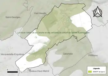 Le territoire communal comprend une ZNIEFF de type 2[Note 2] : la haute vallée de la Canche et ses versants en amont de Sainte-Austreberthe qui se situe dans le pays du Ternois. Il offre un relief de coteau abrupt au Nord et des pentes douces au Sud. Le fond de vallée est constitué de pâturages et de zones de cultures. Les versants les plus pentus et inaccessibles accueillent des boisements[14].