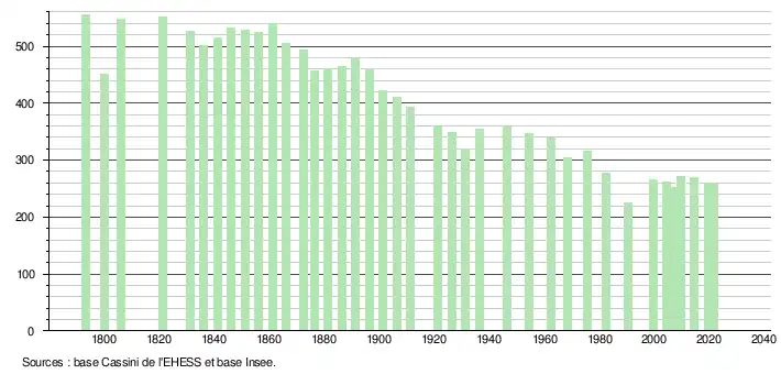L'évolution du nombre d'habitants est connue à travers les recensements de la population effectués dans la commune depuis 1793. Pour les communes de moins de 10 000 habitants, une enquête de recensement portant sur toute la population est réalisée tous les cinq ans, les populations légales des années intermédiaires étant quant à elles estimées par interpolation ou extrapolation[30]. Pour la commune, le premier recensement exhaustif entrant dans le cadre du nouveau dispositif a été réalisé en 2004[31].