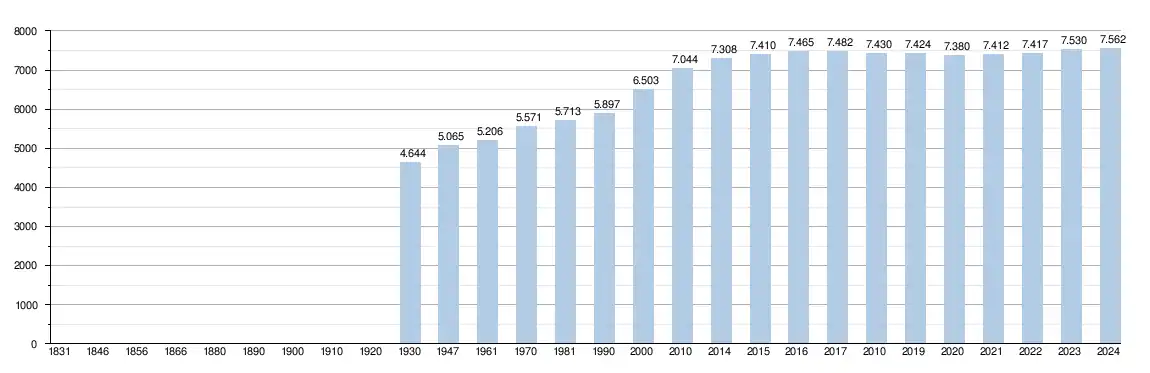 Elle comptait, au début 2024, 7 562 habitants (3 835 hommes et 3 727 femmes), soit une densité de 77,51 habitants/km²[2] pour une superficie de 97,56 km².