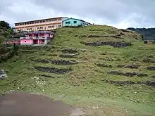 L'axe principal du site a une orientation de S 52° E, aligné le long de l'éperon occupé par les ruines[6]. Le site est réparti sur trois niveaux différents, à savoir le niveau du sol de la crête, une zone de terrain surélevé au nord-est et une dépression au sud-ouest. L'élévation et la dépression étaient toutes deux des caractéristiques naturelles qui ont été intégrées à la ville précolombienne. Plusieurs structures d'alignement sont situées sur la partie nord-est de la crête, et sur l'élévation, avec une vue sur la vallée vers les sources salées voisines. La pente qui occupe la partie sud-ouest du site a été modifiée par la construction de cinq plates-formes à gradins, d'une manière similaire à celle des pyramides méso-américaines. La partie inférieure du site supporte une grande structure qui était probablement une pyramide[1].