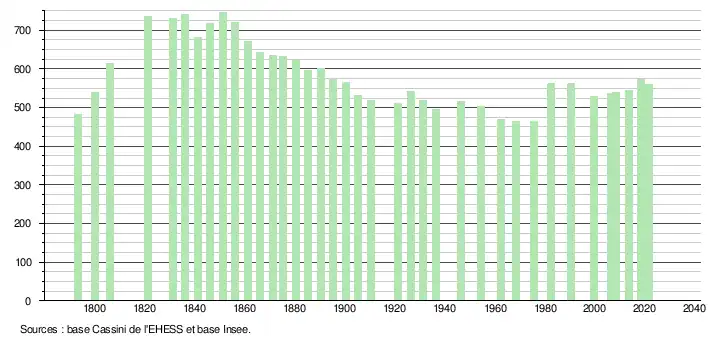 L'évolution du nombre d'habitants est connue à travers les recensements de la population effectués dans la commune depuis 1793. Pour les communes de moins de 10 000 habitants, une enquête de recensement portant sur toute la population est réalisée tous les cinq ans, les populations légales des années intermédiaires étant quant à elles estimées par interpolation ou extrapolation[19]. Pour la commune, le premier recensement exhaustif entrant dans le cadre du nouveau dispositif a été réalisé en 2008[20].