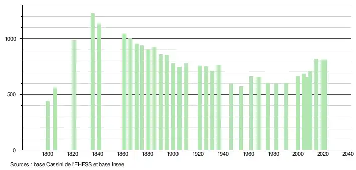 L'évolution du nombre d'habitants est connue à travers les recensements de la population effectués dans la commune depuis 1800. Pour les communes de moins de 10 000 habitants, une enquête de recensement portant sur toute la population est réalisée tous les cinq ans, les populations légales des années intermédiaires étant quant à elles estimées par interpolation ou extrapolation[12]. Pour la commune, le premier recensement exhaustif entrant dans le cadre du nouveau dispositif a été réalisé en 2004[13].