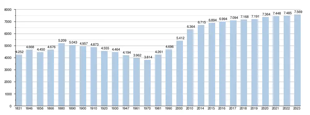 Elle comptait, au , 7 617 habitants (3 769 hommes et 3 848 femmes), soit une densité de 200,03 habitants/km²[1] pour une superficie de 38,08 km².