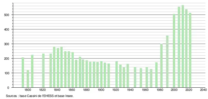 L'évolution du nombre d'habitants est connue à travers les recensements de la population effectués dans la commune depuis 1793. Pour les communes de moins de 10 000 habitants, une enquête de recensement portant sur toute la population est réalisée tous les cinq ans, les populations légales des années intermédiaires étant quant à elles estimées par interpolation ou extrapolation[21]. Pour la commune, le premier recensement exhaustif entrant dans le cadre du nouveau dispositif a été réalisé en 2006[22].