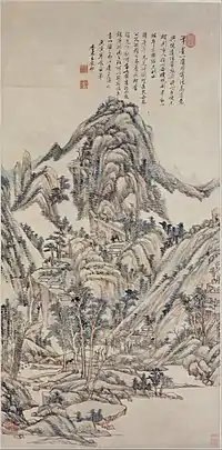 - Wang a tiré sa composition pour cette peinture du maître Yuan, Huang Gongwang (1269–1354), mais il a réduit les formes de paysage de l'artiste en question à des formes géométriques jalonnées de niveaux, tournants et retournants qui mettent en mouvement le paysage de montagne tout entier. Des couleurs contrastées et des plans au sol changeants animent davantage la composition. L'inscription de Wang suggère qu'il a pris un plaisir particulier à terminer ce tableau. : Traduction de la notice sur Metropolitan Museum of Art.