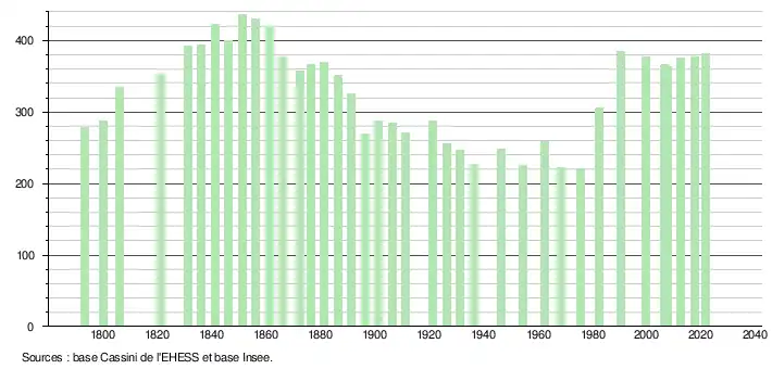 L'évolution du nombre d'habitants est connue à travers les recensements de la population effectués dans la commune depuis 1793. Pour les communes de moins de 10 000 habitants, une enquête de recensement portant sur toute la population est réalisée tous les cinq ans, les populations légales des années intermédiaires étant quant à elles estimées par interpolation ou extrapolation[27]. Pour la commune, le premier recensement exhaustif entrant dans le cadre du nouveau dispositif a été réalisé en 2007[28].