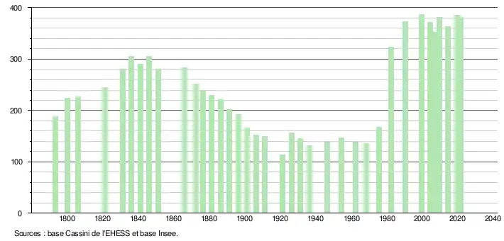 L'évolution du nombre d'habitants est connue à travers les recensements de la population effectués dans la commune depuis 1793. Pour les communes de moins de 10 000 habitants, une enquête de recensement portant sur toute la population est réalisée tous les cinq ans, les populations légales des années intermédiaires étant quant à elles estimées par interpolation ou extrapolation[19]. Pour la commune, le premier recensement exhaustif entrant dans le cadre du nouveau dispositif a été réalisé en 2004[20].