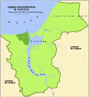 ? Écouter [Fiche]; Warnemünn en bas-allemand) est une station balnéaire située au nord de Rostock, à laquelle elle est administrativement rattachée. Elle se trouve à l'embouchure de la Warnow, qui lui a donné son nom, et donne sur la mer Baltique. Ses plages de 150 mètres de large font partie des plus larges d'Allemagne. Cette petite ville est connue notamment pour son petit port de pêche, la vente de poisson frais en direct des bateaux et sa promenade bordée de restaurants.