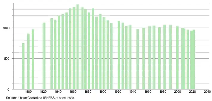 L'évolution du nombre d'habitants est connue à travers les recensements de la population effectués dans la commune depuis 1793. Pour les communes de moins de 10 000 habitants, une enquête de recensement portant sur toute la population est réalisée tous les cinq ans, les populations légales des années intermédiaires étant quant à elles estimées par interpolation ou extrapolation[31]. Pour la commune, le premier recensement exhaustif entrant dans le cadre du nouveau dispositif a été réalisé en 2008[32].