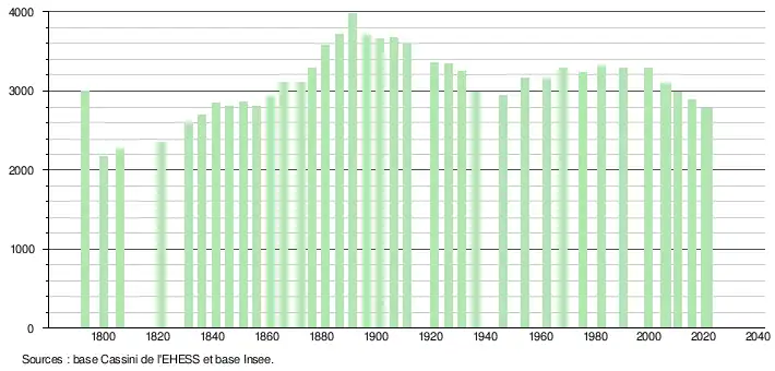 L'évolution du nombre d'habitants est connue à travers les recensements de la population effectués dans la commune depuis 1793. Pour les communes de moins de 10 000 habitants, une enquête de recensement portant sur toute la population est réalisée tous les cinq ans, les populations légales des années intermédiaires étant quant à elles estimées par interpolation ou extrapolation[14]. Pour la commune, le premier recensement exhaustif entrant dans le cadre du nouveau dispositif a été réalisé en 2005[15].