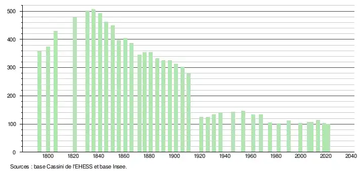 L'évolution du nombre d'habitants est connue à travers les recensements de la population effectués dans la commune depuis 1793. Pour les communes de moins de 10 000 habitants, une enquête de recensement portant sur toute la population est réalisée tous les cinq ans, les populations légales des années intermédiaires étant quant à elles estimées par interpolation ou extrapolation[14]. Pour la commune, le premier recensement exhaustif entrant dans le cadre du nouveau dispositif a été réalisé en 2008[15].