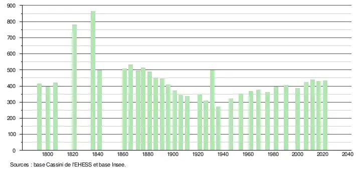 L'évolution du nombre d'habitants est connue à travers les recensements de la population effectués dans la commune depuis 1793. Pour les communes de moins de 10 000 habitants, une enquête de recensement portant sur toute la population est réalisée tous les cinq ans, les populations légales des années intermédiaires étant quant à elles estimées par interpolation ou extrapolation[17]. Pour la commune, le premier recensement exhaustif entrant dans le cadre du nouveau dispositif a été réalisé en 2006[18].