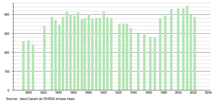 L'évolution du nombre d'habitants est connue à travers les recensements de la population effectués dans la commune depuis 1793. Pour les communes de moins de 10 000 habitants, une enquête de recensement portant sur toute la population est réalisée tous les cinq ans, les populations légales des années intermédiaires étant quant à elles estimées par interpolation ou extrapolation[16]. Pour la commune, le premier recensement exhaustif entrant dans le cadre du nouveau dispositif a été réalisé en 2006[17].
