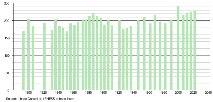 L'évolution du nombre d'habitants est connue à travers les recensements de la population effectués dans la commune depuis 1793. Pour les communes de moins de 10 000 habitants, une enquête de recensement portant sur toute la population est réalisée tous les cinq ans, les populations légales des années intermédiaires étant quant à elles estimées par interpolation ou extrapolation[36]. Pour la commune, le premier recensement exhaustif entrant dans le cadre du nouveau dispositif a été réalisé en 2006[37].