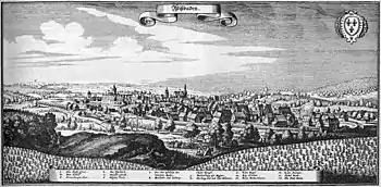 Le blason de la ville montre, tout comme le drapeau de la ville, trois lys d'or (deux en haut, un en bas) sur un fond bleu. Les fleurs, appelées en héraldique Fleur de lys, apparaissent pour la première fois dans le sceau de la ville au XVIe siècle et semblent être d'origine française. La forme actuelle du blason a été officiellement créée en 1906.