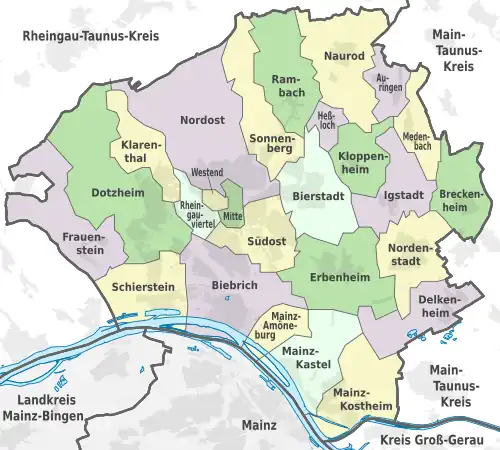 La ville est divisée en 26 arrondissements. On distingue les arrondissements intérieurs (Innere Bezirke) et les arrondissements extérieurs (Äußere Bezirke). Les cinq arrondissements intérieurs (Mitte, Westend, Rheingauviertel, Nordost et Südost) constituent approximativement le centre-ville. Les 21 arrondissements extérieurs sont situés autour du centre-ville.