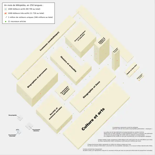 Chaque fenêtre rouge correspond à 1 000 contributeurs « très actifs » (avec plus de 100 contributions par mois), les bleus représentent 1 000 contributeurs « actifs » (plus de cinq contributions par mois). Chaque bonhomme bâton représente un million de visiteurs uniques par mois. Du fait du manque d'information concernant les encyclopédies classiques, il n'y a aucun visiteur dessiné près d'elles.