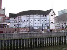 Les troupes pour lesquelles Shakespeare écrit ses premières pièces ne sont pas identifiées avec certitude. La page de titre de l'édition de 1594 de Titus Andronicus indique cette pièce a été jouée par trois compagnies différentes[118]. Après l'épidémie de peste de 1592-1593, c'est la troupe de Shakespeare, les Lord Chamberlain's Men, qui interprète ses textes au Theatre et au Curtain, deux salles du quartier londonien de Shoreditch[119]. L'écrivain Leonard Digges rapporte que le public s'y précipite pour assister aux représentations de la première partie de Henri IV[120]. En conflit avec leur propriétaire, les Lord Chamberlain's Men font raser le Theatre et en utilisent les poutres pour fonder leur propre salle, le Globe, à Southwark. Il s'agit du tout premier théâtre fondé par des acteurs pour des acteurs[121],[122]. Il ouvre ses portes à l'automne 1599 et l'une des premières pièces qui y est jouée est le Jules César de Shakespeare. La plupart de ses chefs-d'œuvre suivants sont écrits pour le Globe, de Hamlet à Othello en passant par Le Roi Lear[121],[123],[124].