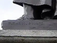 Sur la plinthe de l'original de William Theed dans la collection royale apparaît une seule ligne (sans mention de source) du poème "Le Village abandonné" d'Oliver Goldsmith (l.170) : ...Ainsi, soulager les malheureux était sa fierté, / Et même ses maigres échecs venaient de la Vertu ; / Mais dans son devoir prompt à chaque appel, / Il a observé et pleuré, il a prié et ressenti, pour tous. / Et, comme un oiseau de chaque fond d'affection tente / Pour lancer sa nouvelle progéniture prête à s'élancer vers le ciel, / Il a essayé de chaque art, reproché chaque terne retard, / SÉDUIT DE LUMINEUX MONDES, ET A MONTRE LA VOIE. (capitales ajoutées, comme dans l'inscription)