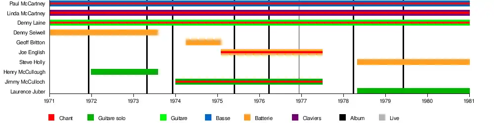 Tout au long de son existence, le groupe reste constitué autour du trio formé par Paul McCartney, Linda McCartney et Denny Laine. Lorsque le groupe se retrouve réduit à ce trio, Paul se charge en plus de ses parties de basse, d'enregistrer la batterie et des morceaux de guitare et de piano ; notamment sur Band on the Run[29]. Le groupe est également composé, à ses débuts en 1971, du batteur Denny Seiwell[85]. En 1972, le groupe est rejoint par le guitariste soliste Henry McCullough afin de pouvoir faire des tournées[86]. Cette formation ne dure cependant que jusqu'au début de l'année 1973, puisque McCullough et Seiwell quittent tous deux le groupe juste avant le départ pour Lagos, où ils devaient enregistrer Band on the Run[28].