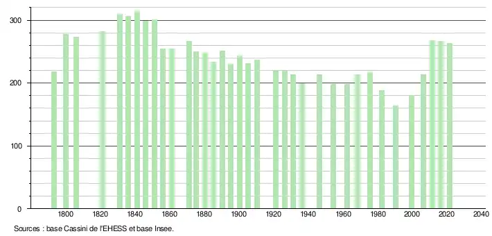 L'évolution du nombre d'habitants est connue à travers les recensements de la population effectués dans la commune depuis 1793. Pour les communes de moins de 10 000 habitants, une enquête de recensement portant sur toute la population est réalisée tous les cinq ans, les populations légales des années intermédiaires étant quant à elles estimées par interpolation ou extrapolation[19]. Pour la commune, le premier recensement exhaustif entrant dans le cadre du nouveau dispositif a été réalisé en 2006[20].