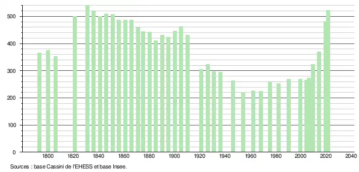 L'évolution du nombre d'habitants est connue à travers les recensements de la population effectués dans la commune depuis 1793. Pour les communes de moins de 10 000 habitants, une enquête de recensement portant sur toute la population est réalisée tous les cinq ans, les populations légales des années intermédiaires étant quant à elles estimées par interpolation ou extrapolation[16]. Pour la commune, le premier recensement exhaustif entrant dans le cadre du nouveau dispositif a été réalisé en 2004[17].