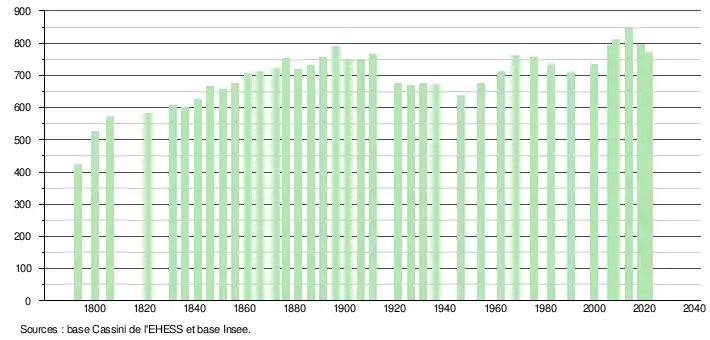 L'évolution du nombre d'habitants est connue à travers les recensements de la population effectués dans la commune depuis 1793. Pour les communes de moins de 10 000 habitants, une enquête de recensement portant sur toute la population est réalisée tous les cinq ans, les populations légales des années intermédiaires étant quant à elles estimées par interpolation ou extrapolation[25]. Pour la commune, le premier recensement exhaustif entrant dans le cadre du nouveau dispositif a été réalisé en 2008[26].