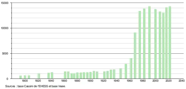 5. Par convention dans Wikipédia, le principe a été retenu de n’afficher dans le tableau des recensements et le graphique, pour les populations légales postérieures à 1999, que les populations correspondant à une enquête exhaustive de recensement pour les communes de moins de 10 000 habitants, et que les populations des années 2006, 2011, 2016, etc. pour les communes de plus de 10 000 habitants, ainsi que la dernière population légale publiée par l’Insee pour l'ensemble des communes.