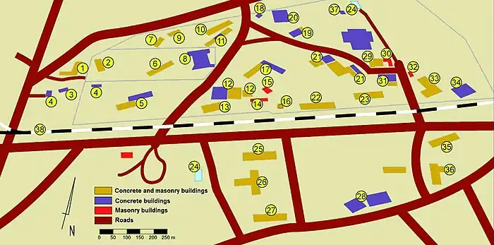 Légende : en marron foncé, les routes ; en rouge, les bâtiments en maçonnerie classique ; en marron clair, les bâtiments classiques renforcés par du béton ; en bleu, les abris construits en béton seul.