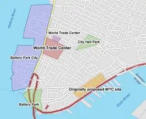 La Lower Manhattan Development Corporation (LMDC) est établie en par le gouverneur de l'État de New York George E. Pataki. Le rôle de cette commission officielle est de superviser le processus de reconstruction en gérant l'assistance fédérale s'élevant à dix milliards de dollars et en travaillant avec la Port Authority, Larry Silverstein, la communauté locale et les entreprises[51]. Durant les mois suivant les attentats des architectes et des urbanistes tiennent plusieurs réunions et forums au sujet de la reconstruction du site[52]. Ils aboutissent à la parution d'un rapport, New York, New Visions, résultat de la collaboration de nombreuses organisations[53]. Une autre initiative est celle de Max Protetch qui expose cinquante concepts et rendus des projets dans sa galerie d'art de Chelsea[54].