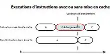 Cette analyse optionnelle peut s’avérer utile pour des architectures munies d’un prédicteur de branchement. La prédiction de branchement optimise l’usage du pipeline. Mais son mécanisme de spéculation peut engendrer des erreurs d’anticipation de chargement d’instruction et donc de la perte de temps. La technique est identique à celle utilisée pour l’analyse des caches. Un classement des instructions de branchement conditionnel est donc réalisé. Une méthode basée sur la technique BBIP (block based instruction prefetching) est proposée par Ni[73]. Des techniques d'optimisation ont aussi été comparées par Plazar en employant un algorithme génétique ou une programmation linéaire en nombres entiers[74],[75].Un cas d'anomalie due à la prédiction de branchement est illustré ci-contre dans le schéma « Anomalie causée par spéculation (cache) ». De mauvaises surprises peuvent se révéler allant à l’encontre de l’intérêt du cache mémoire prévu pour accélérer le traitement des instructions. En effet, dans le premier cas, l’instruction A se termine avant la condition de branchement. Le processeur engage alors une spéculation qui peut s’avérer être mauvaise, décalant alors le départ de l’instruction C attendue à cause du temps de chargement de l’instruction B dans le cache. Tandis que dans le cas de l’absence de prédiction, le traitement des instructions se fait finalement plus rapidement.