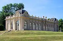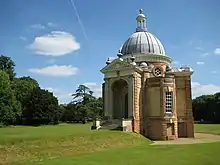 Le parc est divisé par une large promenade centrale en gravier, poursuivie par un long canal qui mène à une maison de banquet dans un pavillon baroque conçu par Thomas Archer (en) et achevé en 1711 [7]. Le concepteur de jardin Batty Langley est employé dans les années 1730 [8]. L'intérieur du pavillon est décoré d'impressionnantes colonnes ioniques en trompe-l'œil. Les canaux de délimitation sont modifiés pour prendre une forme plus naturelle par Capability Brown, qui y travaille entre 1758 et 1760, et qui entoure la zone formelle centrale d'un canal et d'un bois. Les jardins et les maisons de jardin sont cartographiés par John Rocque en 1735 [9]. Au cours des XVIIIe et XIXe siècles [8], une orangerie et des fontaines en marbre sont ajoutées. Le bain public (parfois appelé bain romain, ermitage et grotte) est construit et ses terrains aménagés entre 1769 et 1772 environ [8],[10].