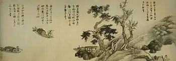 - Le haut d'une branche de bambou au-dessus d'une pierre, longue inscription du peintre en écriture cursive.