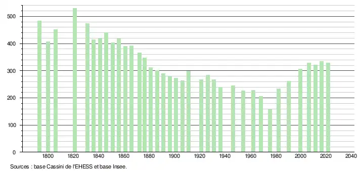 L'évolution du nombre d'habitants est connue à travers les recensements de la population effectués dans la commune depuis 1793. Pour les communes de moins de 10 000 habitants, une enquête de recensement portant sur toute la population est réalisée tous les cinq ans, les populations légales des années intermédiaires étant quant à elles estimées par interpolation ou extrapolation[25]. Pour la commune, le premier recensement exhaustif entrant dans le cadre du nouveau dispositif a été réalisé en 2006[26].